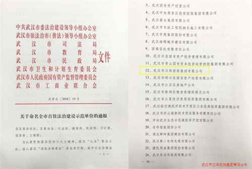 2018年12月25日,武漢市漢陽控股集團有限公司迎來一份《關(guān)于命名全市百佳法治建設(shè)示范單位的通報》文件,標志著我司法治建設(shè)工作切實做到有重點、有特點、有亮點、有看點。